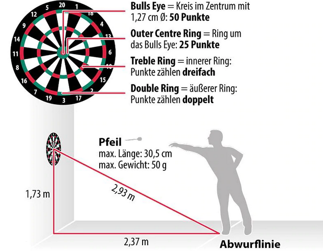 Die Standardhöhe vom Boden bis zum Bullauge auf der Dartscheibe beträgt 173cm.