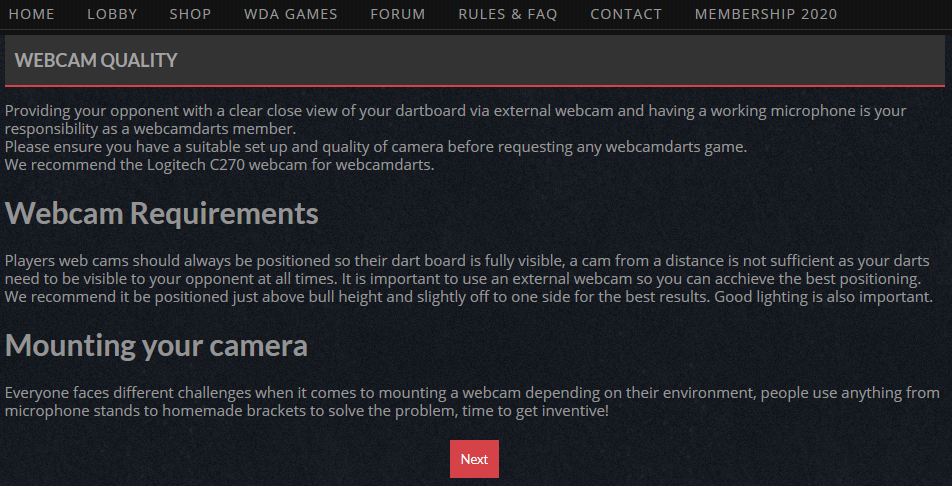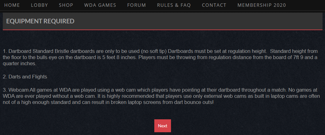 Alle Spiele bei WDA werden mit einer Webcam gespielt, die die Spieler während eines Spiels auf ihre Dartscheibe ausrichten müssen.