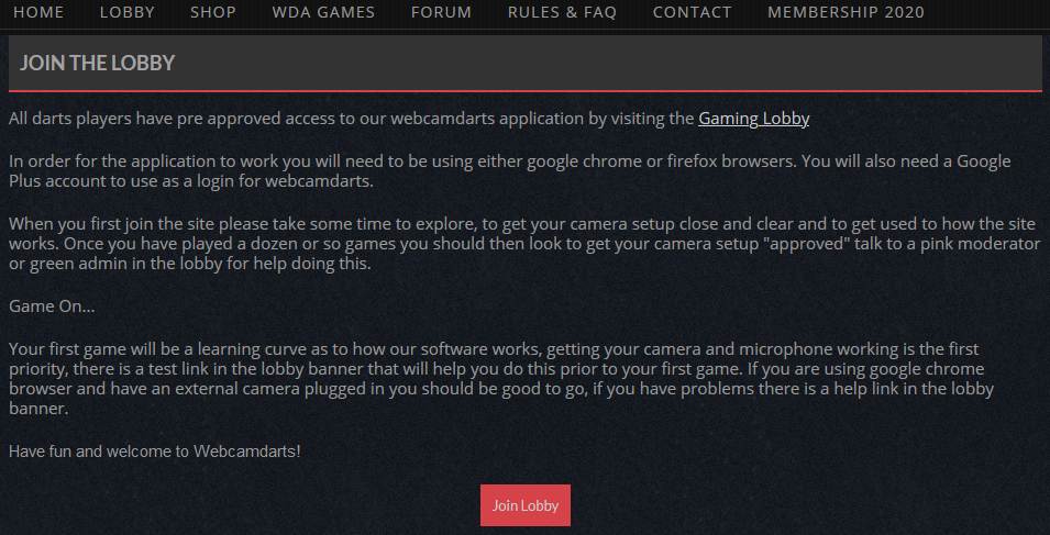 Bitte stellen Sie sicher, dass Sie über eine geeignete Einrichtung und Qualität der Kamera verfügen, bevor Sie ein Webcamdart-Spiel anfordern.