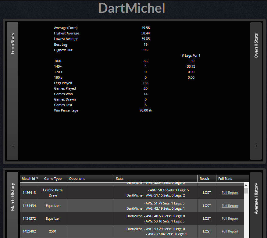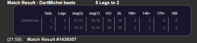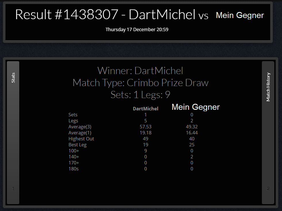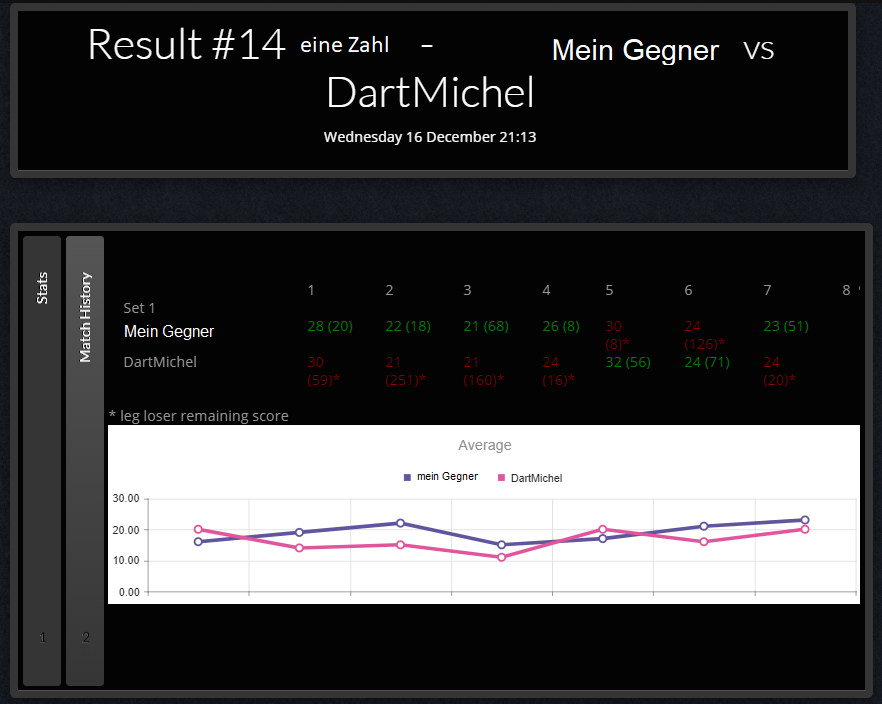 Restpunktzahl vom Gegner, Geworfene Darts und welches Checkout in welchem Leg erzielt wurde.