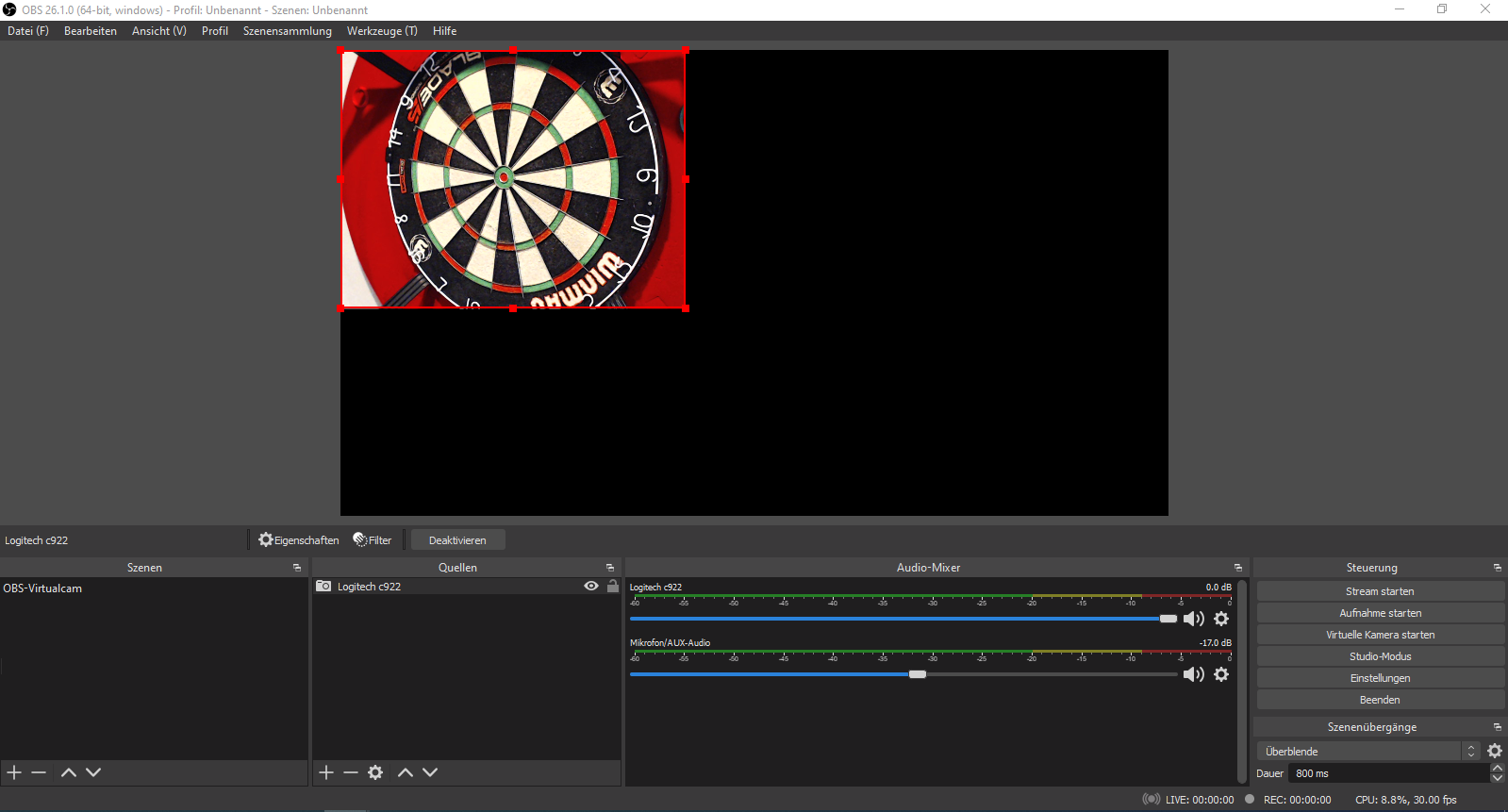 Voraussetzung ist eine Kamera, das Dartboard und die Software OBS Studio
